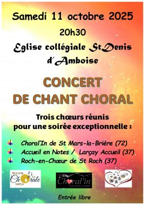 Le samedi 11 octobre 2025, à partir de 20h30, la chorale de notre Association, Accueil en Notes, se produira à l’église collégiale Saint-Denis d’Amboise. Elle sera accompagnée des chœurs Choral’In de Saint-Mars-la-Brière (72) et Roch-en-Chœur de Saint-Roch (37).